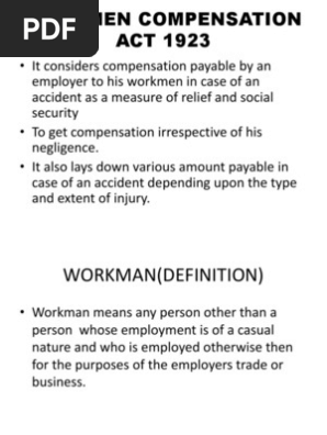 The presentation includes the calculation of compensation in workman's compensation act,1923 to the injured or deceased employee. A special computation date for new acted were also technical in nature: 1 workmen s compensation act chapter 88:05 act 24 of 1960 amended by 12 of of of of of of 1997 current authorised pages pages authorised (inclusive) by l.r.o /2006 l.r.o. Earlier this act was known as the workmen compensation act, 1923. This security is offered by the law for people who work.