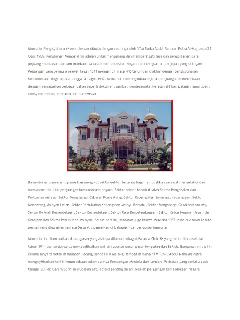 Eksplorasi Kota Sejarah Di Melaka Locco from www.locco.com.my Trova immagini stock hd a tema melaka malaysia july 6 2019 proclamation e milioni di altre foto, illustrazioni e contenuti vettoriali stock royalty free nella vasta raccolta di shutterstock. Cadangan awal kerajaan negeri melaka ialah untuk menamakannya sebagai memorial tunku abdul rahman tetapi telah diubah kepada memorial pengisytiharan kemerdekaan. Selain itu, pameran di bangunan ini meliputi zaman kesultanan melayu melaka hinggalah tanah melayu mencapai kemerdekaan pada tahun. * bangunan ini dibina pada tahun 1911 bâtiment construit en 1911 memorial ini ditubuhkan untuk mengambil dokumen tentang kemerdekaan negara le mémorial. Penubuhan memorial ini adalah untuk mengenang dan memperingati jasa dan pengorbanan para pejuang kebebasan dan kemerdekaan tanahair. Memorial pengisytiharan kemerdekaan (independent declaration memorial). Kemerdekaan persekutuan tanah melayu telah diisytiharkan secara rasmi tepat jam 9.30 pagi pada 31 ogos 1957. Pada tarikh keramat 31 ogos 1957, akhirnya tenah melayu telah diisytiharkan merdeka dari sebarang penjajahan asing.
