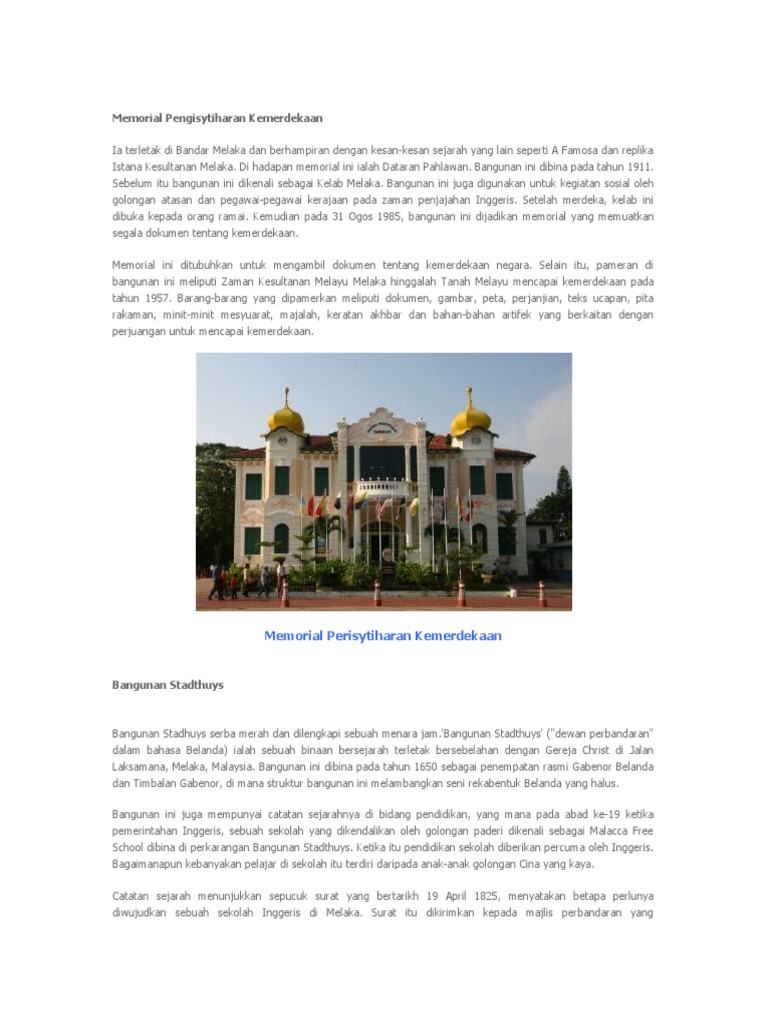 Memorial pengisytiharan kemerdekaan, jalan parameswara, melaka 75000 malaysia. Pengarah memorial pengisytiharan kemerdekaan jalan parameswara bandar hilir 75000 melaka bandaraya bersejarah. Bangunan bersejarah di melaka memorial pengisytiharan kemerdekaan istana kesultanan melayu melaka masjid peringgit masjid tengke. Selain itu, pameran di bangunan ini meliputi zaman kesultanan melayu melaka hinggalah tanah melayu mencapai kemerdekaan pada tahun. Pharmrunmelaka2019 is at memorial pengisytiharan kemerdekaan, bandar hilir, melaka.